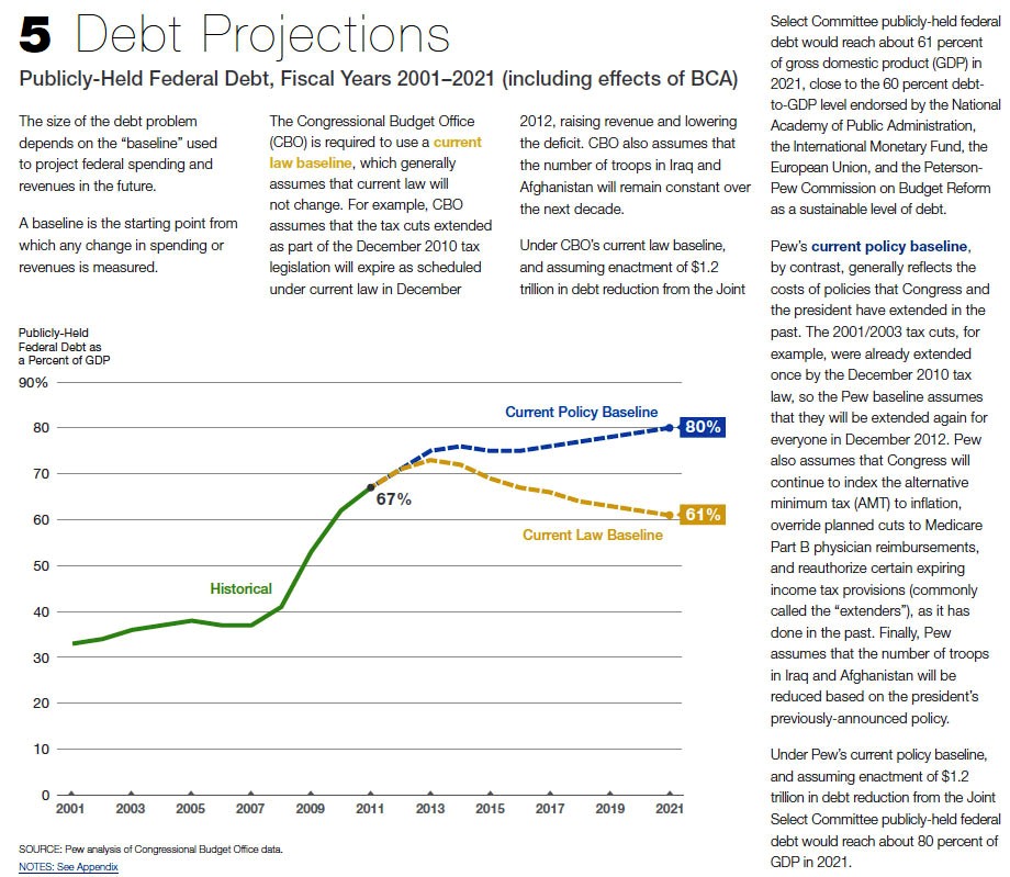 By now nobody should have any doubts as to just how disturbing America's fiscal debacle is. For those naive and innocent few who still think there is a Hollywood ending with a pot of gold awaiting everyone at the end of the rainbow, we present the following "10 essential fiscal charts" from the Pew Policy Institute. To be sure, these are all charts summarizing data that has appeared on Zero Hedge repeatedly over the years in some way shape or form. Pew does, however, have a flair for dramatic visual presentation. In Pew's own words: "Since April 2010, the Pew Fiscal Analysis Initiative has published several reports explaining the medium-and long-term fiscal challenges facing the federal government. With stagnating economic conditions and the passage of new legislation, especially the Budget Control Act of 2011, the outlook for the deficit and debt has changed considerably over the past six months. We have created 10 charts that illustrate how the choices made over the last 10 years contributed to our nation's debt and the challenges currently facing the Joint Select Committee on Deficit Reduction." So without further ado...